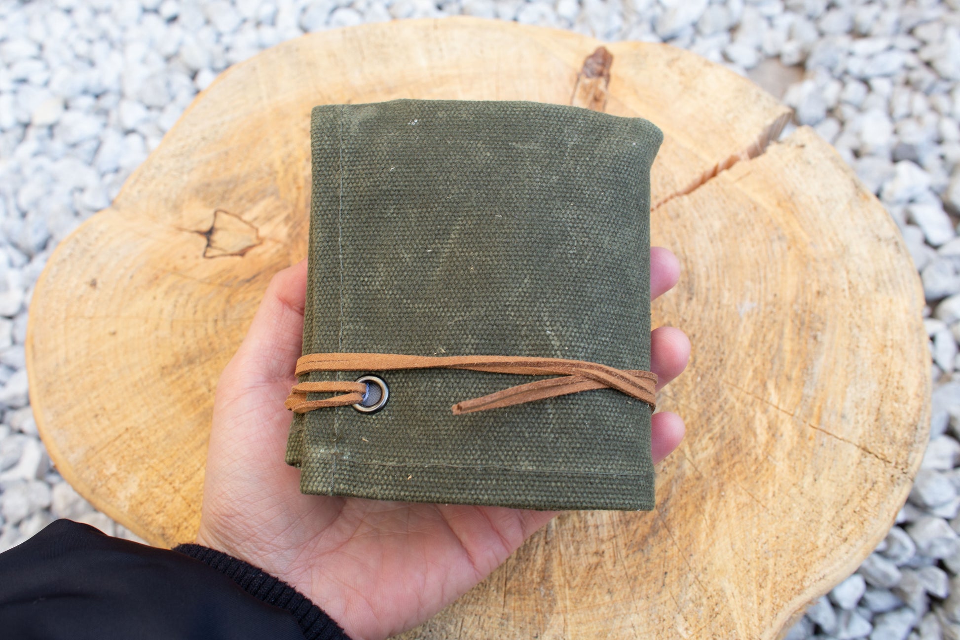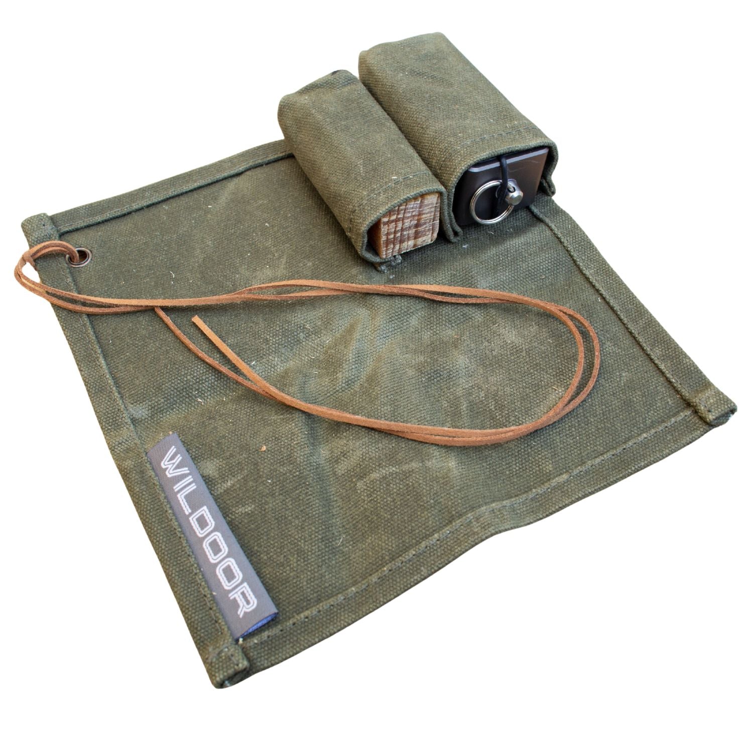 16オンスの厚手のキャンバス生地を使用した専用ケースです。大小2つのポケットが付属します。展開した状態では火口(ほくち)を作る際の作業用スペースとしてご活用いただけます。